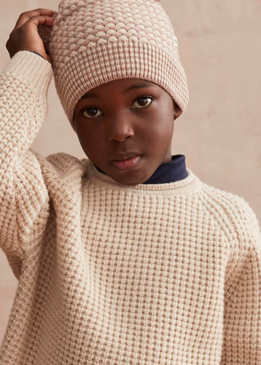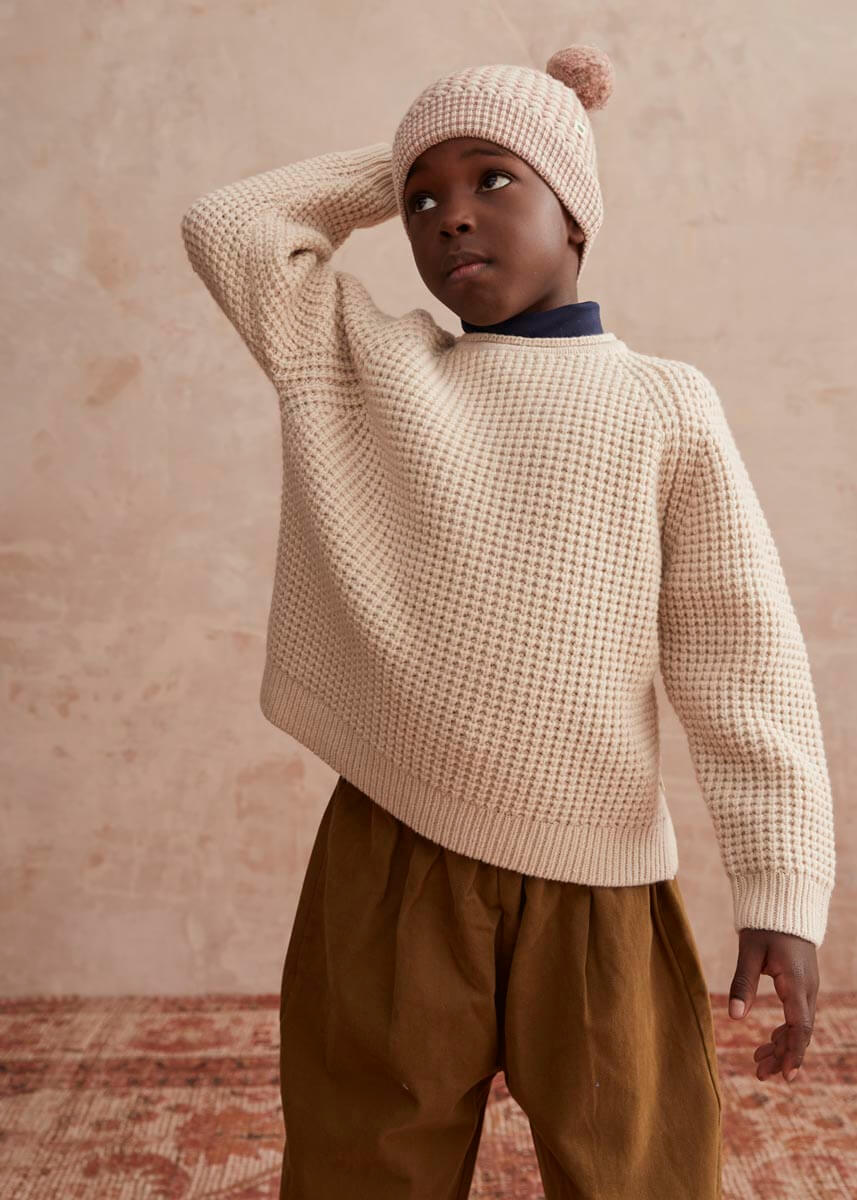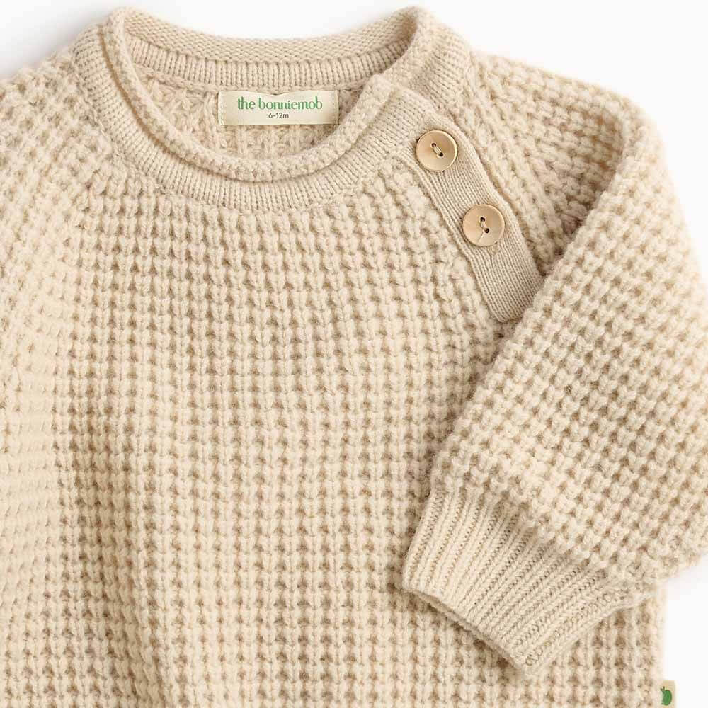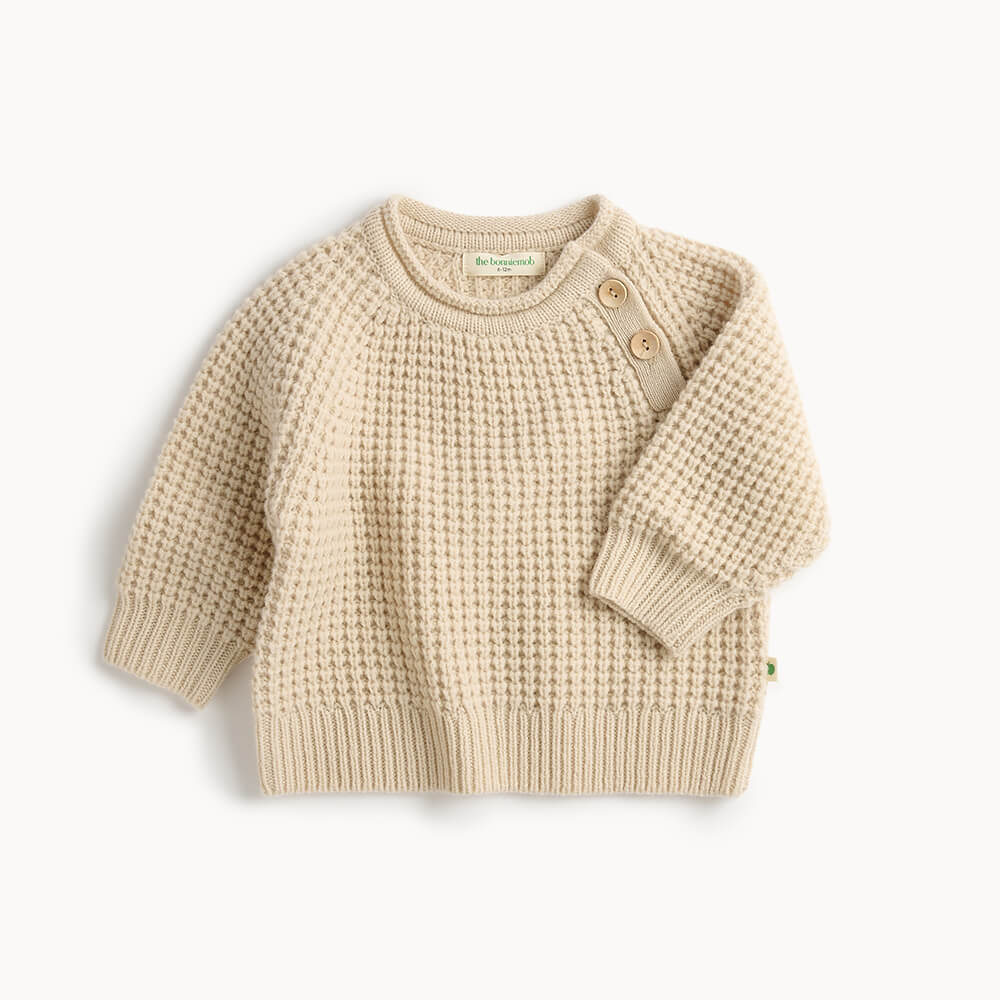 Mjúk og hlý peysa með handprjónaðri áferð í fallegum "oatmilk" lit. Minnstu stærðirna eru með viðartölum sem gefa fallegt og klassískt útlit.